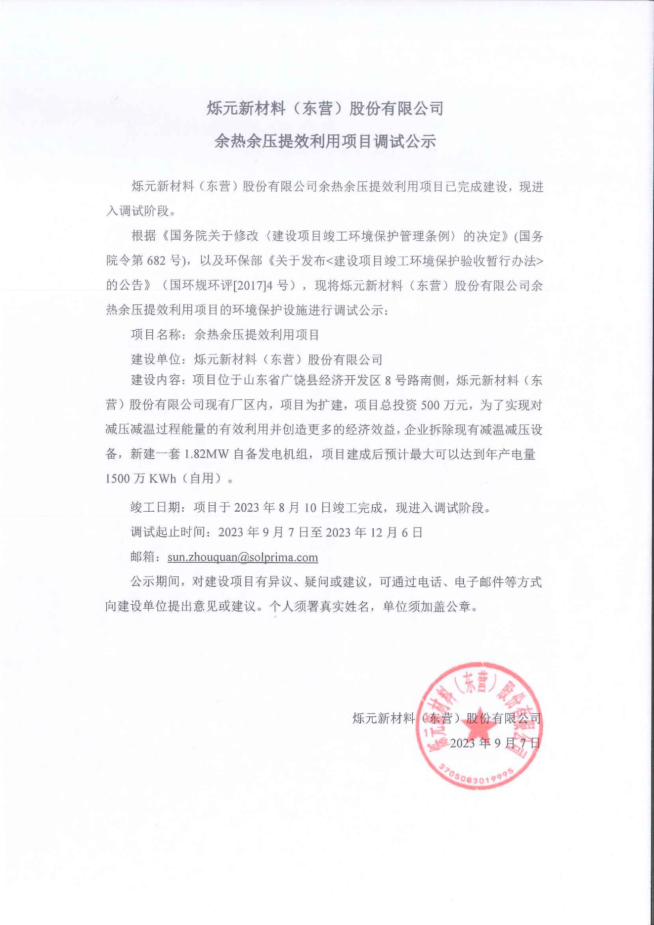 石家(jia)庄义浩(hao)机械制(zhi)造有限(xian)公司餘(yu)熱餘壓(ya)提效利(lì)用項目(mu)調試公(gōng)示