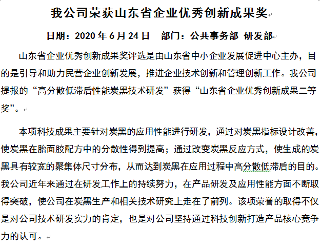 我公(gōng)司榮獲山(shān)東省企業(yè)優秀創新(xīn)成果獎